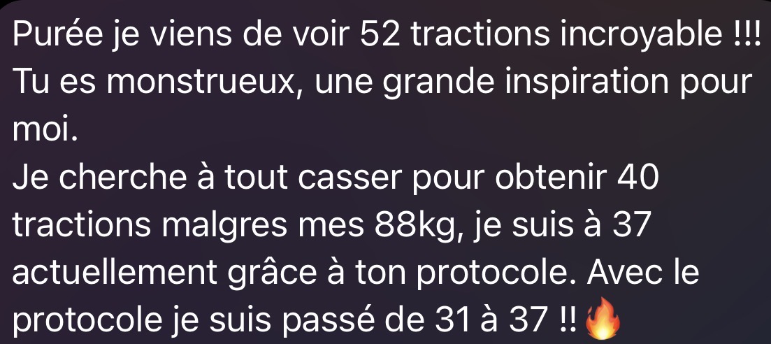 Que tu sois capable d’une seule traction ou que tu enchaînes déjà plusieurs répétitions, mon protocole unique est conçu pour t’amener à un niveau supérieur. Grâce à une gestion parfaite du volume, de l’intensité et de la récupération, ce programme garantit une progression, quel que soit ton point de départ. Ce protocole m’a permis de briser mon plateau à 47 tractions pour dépasser les 50